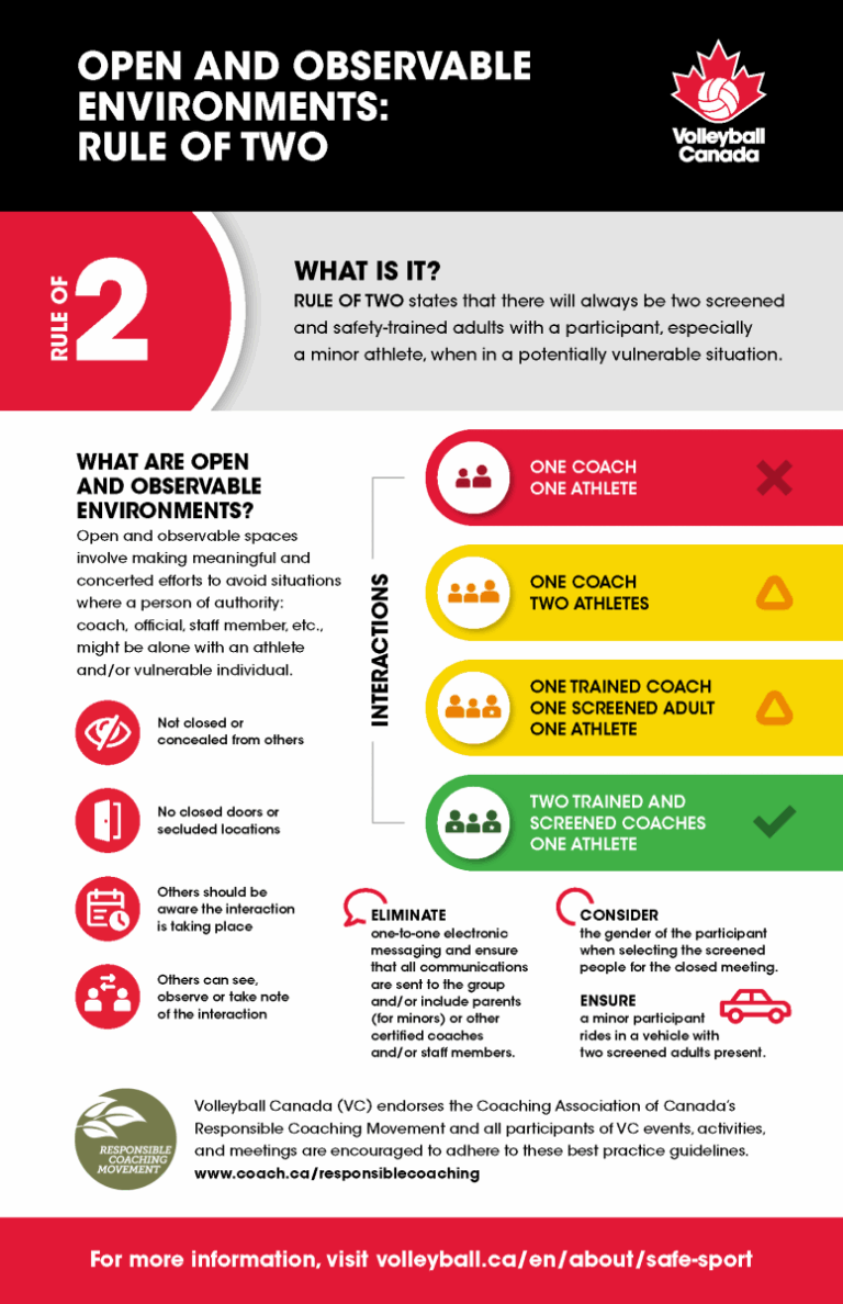 Commonly referred to as the Rule of Two, it means that there will always be two screened and safety-trained adults with a participant, especially a minor athlete, when in a potentially vulnerable situation. Applying the Rule of Two is a measure that helps mitigate opportunities for maltreatment and abuse to occur.